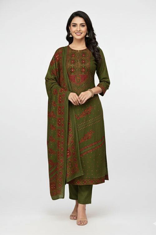Elegant Olive Green Printed Winter Kurta Set with Rust Accents