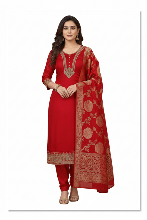 Elegant Ruby Red Suit with Gold Zari Embroidery and Heavy Woven Banarasi Dupatta